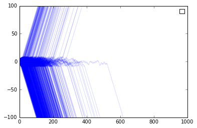It is more likely that individuals will have varying degrees of concern for the current level of adoption. If we replace the r and s parameters, each timestep, with a value drawn from an exponential distribution with the same average value as our previous simulations, we get some rather unusual results.